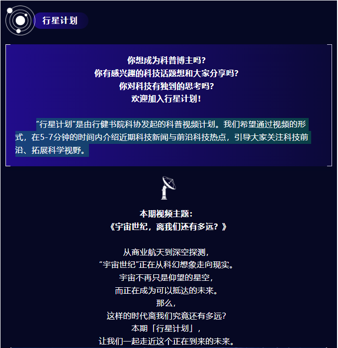 行健科协丨宇宙世纪,离我们还有多远?——“行星计划”第六期发布!“行星计划”是由行健书院科协发起的科普视频计划。我们希望通过视频的形式,在5-7分钟的时间内介绍近期科技新闻与前沿科技热点,引导大家关注科技前沿、拓展科学视野。 -